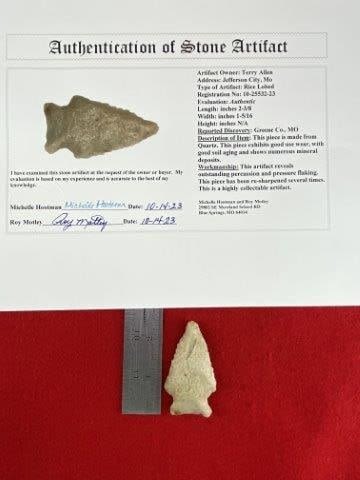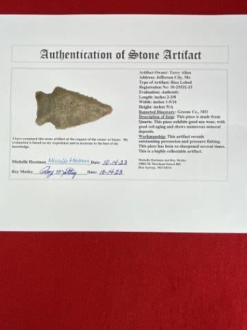 Please see picture for measurement. It is from Greene County Missouri.It comes with a Motley Certificate of Authenticity.These artifacts are from multiple collections from around the United States. KEY WORDS: NATIVE AMERICAN INDIAN ARTIFACT ARTIFACTS ARROWHEAD ARROWHEADS MISSISSIPPIAN QUAPAW CADDO POTTERY COINS MORGAN DOLLAR PEACE DOLLAR SILVER COINS