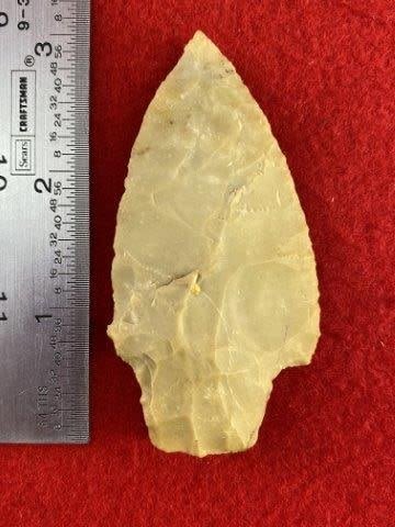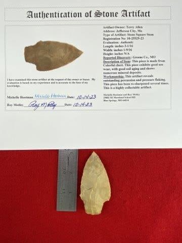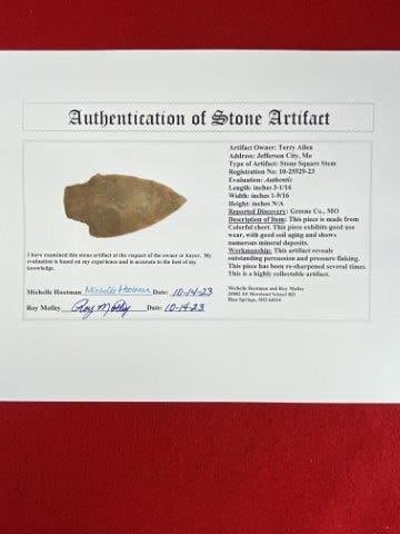 Please see picture for measurement. It is from Greene County Missouri.It comes with a Motley Certificate of Authenticity.These artifacts are from multiple collections from around the United States. KEY WORDS: NATIVE AMERICAN INDIAN ARTIFACT ARTIFACTS ARROWHEAD ARROWHEADS MISSISSIPPIAN QUAPAW CADDO POTTERY COINS MORGAN DOLLAR PEACE DOLLAR SILVER COINS