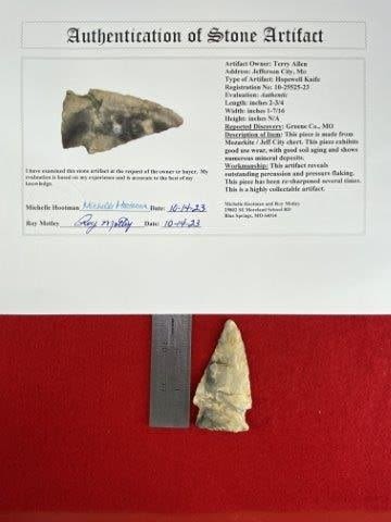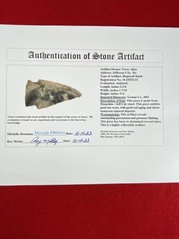 Please see picture for measurement. It is from Greene County Missouri.It comes with a Motley Certificate of Authenticity.These artifacts are from multiple collections from around the United States. KEY WORDS: NATIVE AMERICAN INDIAN ARTIFACT ARTIFACTS ARROWHEAD ARROWHEADS MISSISSIPPIAN QUAPAW CADDO POTTERY COINS MORGAN DOLLAR PEACE DOLLAR SILVER COINS
