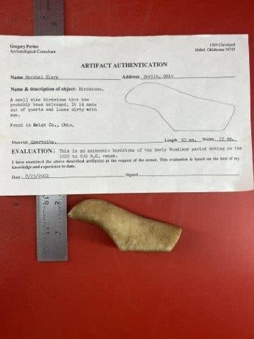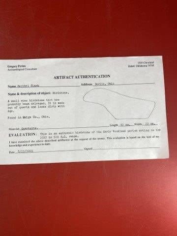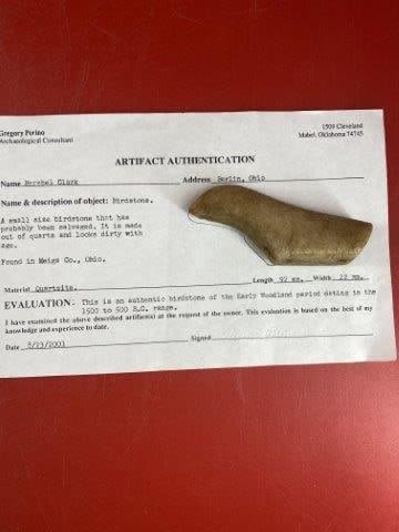 Please see picture for measurement. It was found in Meigs County Ohio. It comes with a Greg Perino Certificate of Authenticity. These artifacts are from multiple collections from around the United States. KEY WORDS: NATIVE AMERICAN INDIAN ARTIFACT ARTIFACTS ARROWHEAD ARROWHEADS MISSISSIPPIAN QUAPAW CADDO POTTERY COINS MORGAN DOLLAR PEACE DOLLAR SILVER COINS