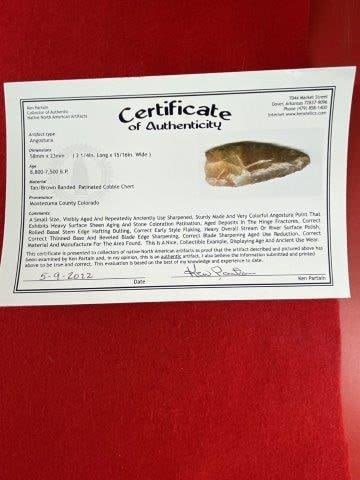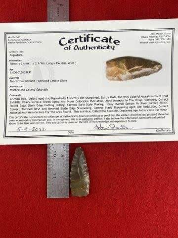 Please see picture for measurement. It is from Montezuma County Colorado. It comes with a Ken Partain Certificate of Authenticity. These artifacts are from multiple collections from around the United States. KEY WORDS: NATIVE AMERICAN INDIAN ARTIFACT ARTIFACTS ARROWHEAD ARROWHEADS MISSISSIPPIAN QUAPAW CADDO POTTERY COINS MORGAN DOLLAR PEACE DOLLAR SILVER COINS