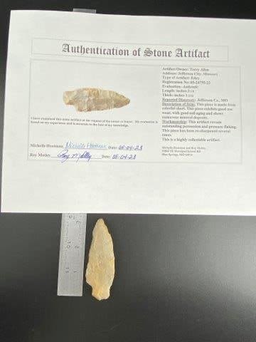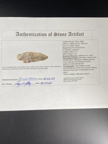 Please see picture for measurement. It comes with a Roy Motley Certificate of authenticity. It is from Jefferson City County Missouri. These artifacts are from multiple collections from around the United States. KEY WORDS: NATIVE AMERICAN INDIAN ARTIFACT ARTIFACTS ARROWHEAD ARROWHEADS MISSISSIPPIAN QUAPAW CADDO POTTERY COINS MORGAN DOLLAR PEACE DOLLAR SILVER COINS