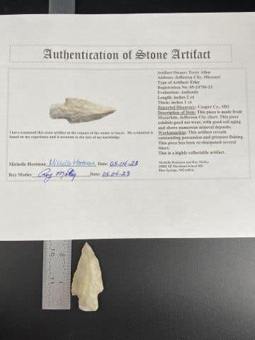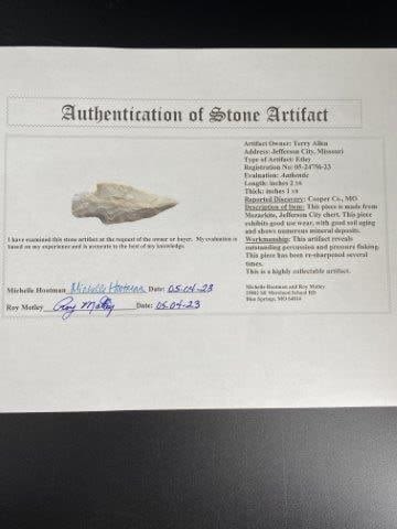 Please see picture for measurement. It comes with a Roy Motley Certificate of authenticity. It is from Cooper County Missouri. These artifacts are from multiple collections from around the United States. KEY WORDS: NATIVE AMERICAN INDIAN ARTIFACT ARTIFACTS ARROWHEAD ARROWHEADS MISSISSIPPIAN QUAPAW CADDO POTTERY COINS MORGAN DOLLAR PEACE DOLLAR SILVER COINS
