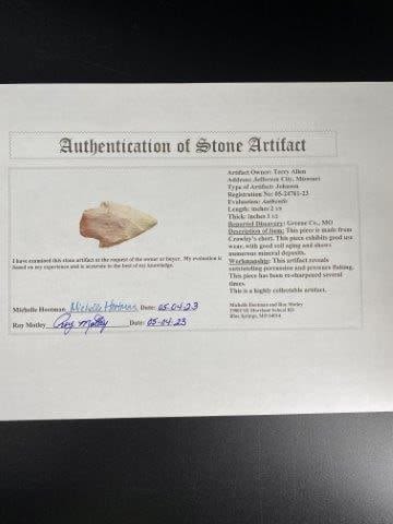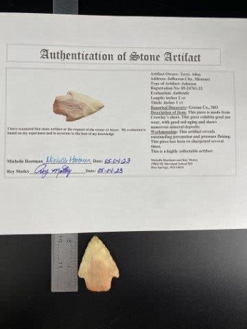 Please see picture for measurement.It comes with a Roy Motley Certificate of authenticity. It is from Greene County Missouri. These artifacts are from multiple collections from around the United States. KEY WORDS: NATIVE AMERICAN INDIAN ARTIFACT ARTIFACTS ARROWHEAD ARROWHEADS MISSISSIPPIAN QUAPAW CADDO POTTERY COINS MORGAN DOLLAR PEACE DOLLAR SILVER COINS