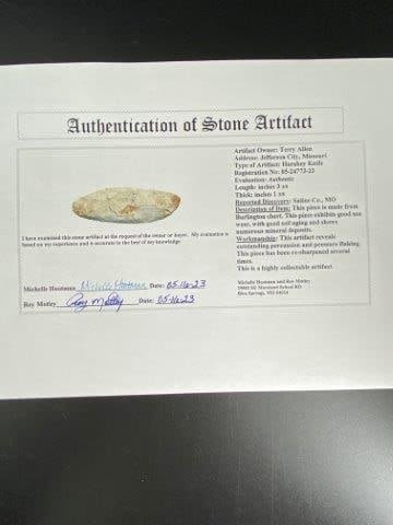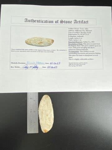 Please see picture for measurement. It comes with a Roy Motley Certificate of authenticity. It is from Saline County Missouri. These artifacts are from multiple collections from around the United States. KEY WORDS: NATIVE AMERICAN INDIAN ARTIFACT ARTIFACTS ARROWHEAD ARROWHEADS MISSISSIPPIAN QUAPAW CADDO POTTERY COINS MORGAN DOLLAR PEACE DOLLAR SILVER COINS