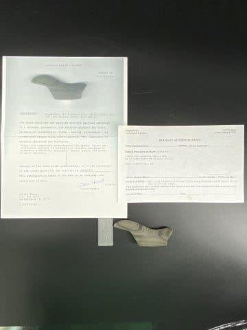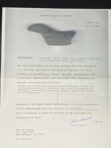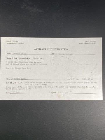 Please see picture for measurement. It comes with a Greg Perino and a Calvin Howard Certificate of Authenticity. Found in Starke County Indiana. These artifacts are from multiple collections from around the United States. KEY WORDS: NATIVE AMERICAN INDIAN ARTIFACT ARTIFACTS ARROWHEAD ARROWHEADS MISSISSIPPIAN QUAPAW CADDO POTTERY COINS MORGAN DOLLAR PEACE DOLLAR SILVER COINS