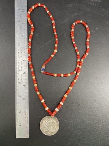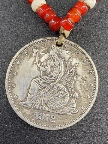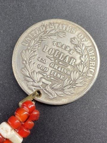 1872 Trade Dollar necklace with Trade Beads Indian Artifact Arrowhead