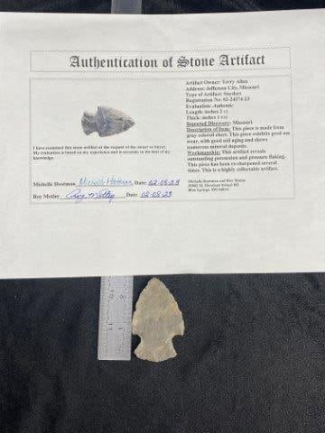 It is 2&1/2 by 1&9/16. It is from Missouri. It comes with a Roy Motley Certificate of Authenticity.Please see picture for measurement. These artifacts are from multiple collections from around the United States. KEY WORDS: NATIVE AMERICAN INDIAN ARTIFACT ARTIFACTS ARROWHEAD ARROWHEADS MISSISSIPPIAN QUAPAW CADDO POTTERY COINS MORGAN DOLLAR PEACE DOLLAR SILVER COINS