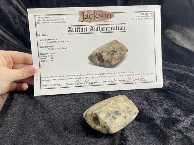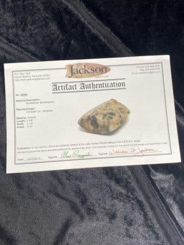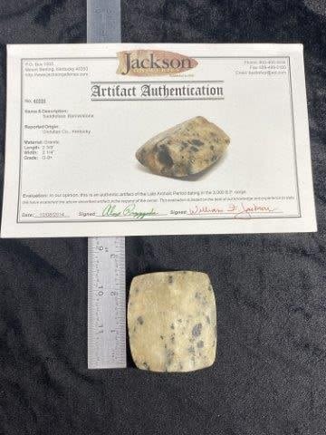 It is 2&3/8 by 2&1/4. It is from Christian County Kentucky. It comes with a Jackson Certificate of Authenticity. Please see picture for measurement. These artifacts are from multiple collections from around the United States. KEY WORDS: NATIVE AMERICAN INDIAN ARTIFACT ARTIFACTS ARROWHEAD ARROWHEADS MISSISSIPPIAN QUAPAW CADDO POTTERY COINS MORGAN DOLLAR PEACE DOLLAR SILVER COINS
