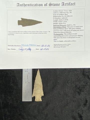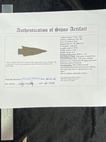 Please see picture for measurement. It is from Bell County Texas. It comes with a Roy Motley Certificate of Authenticity.These artifacts are from multiple collections from around the United States. KEY WORDS: NATIVE Amerman INDIAN ARTIFACT ARTIFACTS ARROWHEAD ARROWHEADS MISSISSIPPIAN QUAPAW CADDO POTTERY COINS MORGAN DOLLAR PEACE DOLLAR SILVER COINS
